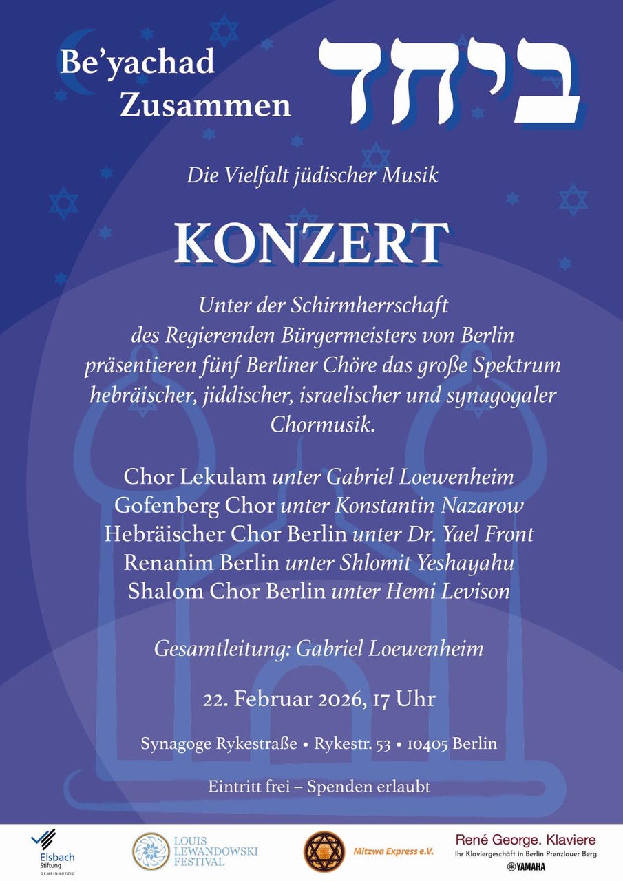 Unter der Schirmherrschaft des Regierenden Bürgermeisters von Berlin präsentieren fünf Berliner Chöre das große Spektrum hebräischer, jiddischer, israelischer und synagogaler Chormusik.